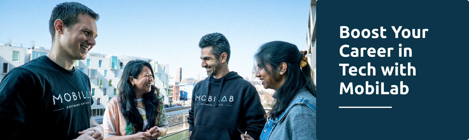 We are dedicated to growing our employees. Our company culture encourages knowledge sharing and learning with a dedicated MobiLab Career Development. Our headquarters, located in the heart of Cologne, offers a creative work environment. We provide a range of benefits, including a public transport ticket, access to industry conferences, a company pension scheme, and more.