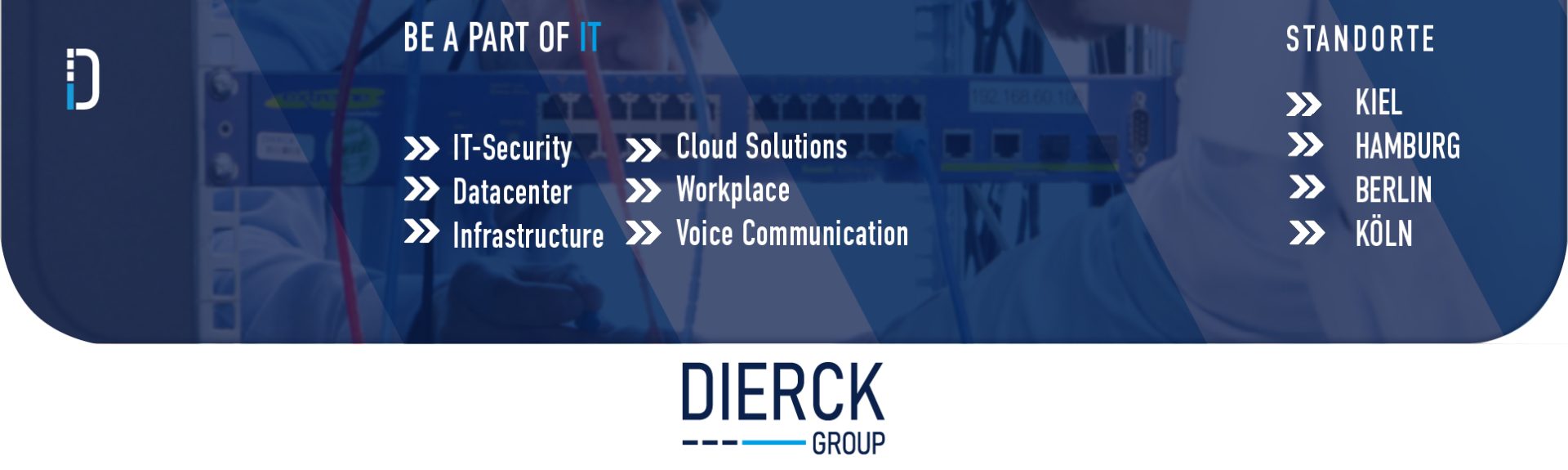 Die DIERCK GROUP ist ein dynamisches und zukunftsorientiertes Unternehmen im Bereich der Informations- und Kommunikationstechnologie mit über 260 Mitarbeitern und Mitarbeiterinnen sowie über 140 Jahren Unternehmensgeschichte an den Standorten Hamburg, Berlin, Troisdorf bei Köln und dem Hauptsitz Schwentinental bei Kiel.